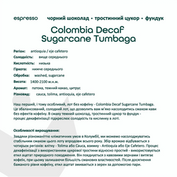Colombia Decaf Tumbaga - збалансована кава без кофеїну. Вона має високу солодкість і легку кислотність, що робить смак м'яким і гармонійним. Ідеальний вибір для тих, хто цінує насичені солодкі відтінки без різкої кислинки.